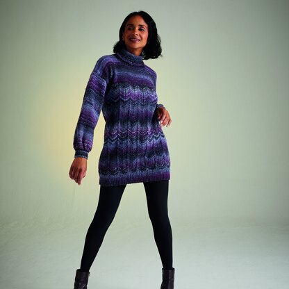 A stunning addition to your fall and winter wardrobe, Sirdar 10713 Night Blooming Roll Neck will add warmth, color, and style. This cozy tunic gets its vibrant color from Jewelspun, a machine-washable acrylic yarn that has a beautiful handspun look and self-striping colors. Pair it with leggings for a modern look or layer it over your favorite jeans or yoga pants for the ultimate cozy outfit—it’ll add color and style no matter what! The Night Blooming Roll Neck tunic is knit flat in pieces from the bottom up and seamed with dropped shoulders, a beautiful chevron pattern on the body, and an ulta-cozy turtleneck. Choose your favorite colorway of Jewelspun and get ready to cast on your new favorite layer! Chevron pattern is written out only.