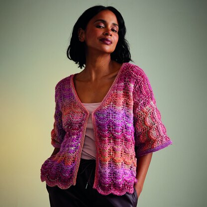 The Sirdar 10715 Hot House Flowers Cardigan has a beautiful allover lace pattern that lends a feminine feel to the finished sweater. Along with the feather and fan lace, your finished cardi gets a boost from the self-striping colorways of Jewelspun yarn. This machine-washable acrylic yarn has handspun-inspired colors that shift effortlessly as you work. The Hot House Flowers Cardigan is knit flat in pieces from the bottom up with the short sleeves knit flat separately and sewn in during finishing. A narrow garter stitch neckband and a single hook and eye closure are the final details that have your cardi ready to add vibrant color and easy style to any outfit! Lace pattern is written out only.