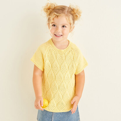 Sirdar 2564 Citrus Slice Raglan Tops in Snuggly Replay features juicy citrus segments in textured stitches with the options of long or short sleeves. The pullover is knit flat in pieces from the bottom up and then seamed. Snuggly Replay from Sirdar is a soft and machine-washable blend of cotton and acrylic that comes in a palette of softly heathered shades. The textured pattern is in chart form only.