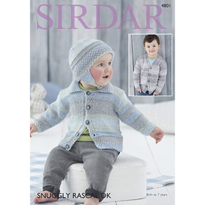 Sirdar 4801 Cardigan & Helmet pattern set offers options for a v-neck or crewneck cardigan and matching hat with delightful Irish moss borders. Knit in Sirdar Snuggly Rascal DK—a machine-washable blend of nylon and acrylic— these sweater and hat sets are guaranteed to please.