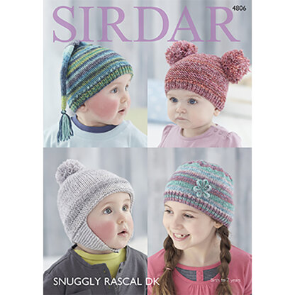 4806 Hats from Sirdar offers four cute hats to fit children from newborn all the way up to 7 years. All four hats are worked flat from the bottom up and seamed. Knit in the cuddly Snuggly Rascal DK; these hats are sure to keep little heads warm all winter long!