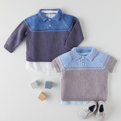 The Sirdar 5358 Rugby Shirts are pint-sized and sporty, perfect for warmer weather in the smooth and soft Snuggly Baby Bamboo DK. With a fold-over collar, button placket, stripes, and options for both short and long sleeves, you will be able to make the perfect raglan sweater for your little one. Choose the colors pictured or your own combination for a springy and comfortable sweater that will be at home at holiday dinners and playtime as well. This sweater is knit flat in pieces from the bottom up and seamed.