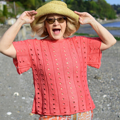 Skacel Sunrise Toss-on Tee is a fabulous women’s pullover knit in HiKoo PopCycle. The tee is ready to be packed and on vacation on a warm sunny island. Sunrise Toss-on Tee is knit flat in pieces from the bottom up and then seamed. HiKoo PopCycle is a fingering weight blend of bamboo and polyester from recycled plastic bottles. That’s right; each hank recycles two plastic bottles! PopCycle will keep you cool in the warmer months, and the fashion-forward colorways have a subtle tweed thanks to the dye-resistant polyester.