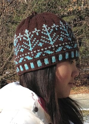 Sleeping Trees A Classic Brown & Blue Fair Isle Hat In winter in the Northeast, all the hardwood trees are bare. Not dead, just sleeping, waiting to make a glorious comeback in the spring. This is a “tip of the hat” to one of my favorites, an ornamental pear tree that is often seen in the background of my hat photos. Corrugated rib at the brim, a classic border topped off with winter’s sleeping trees. All in a classic combination of brown and blues. Something so soothing about these colors. Enjoy. Because there are very few long “carries” or “floats” this pattern is a good “first” colorwork project. There are never more than 2 colors in a round and only 2 or 3 rounds with carries longer than 4 stitches. When carrying yarns on the back, do NOT carry too tightly! Better too loose than too tight or hat will lose its stretch. YouTube has a wealth of videos showing how to carry yarn on back of work. Look for them if you are new to color work. Just search