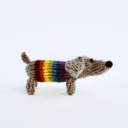 This striped Small Sausage Dog is a quick little knit to use up odds and ends of yarn. You could make one as a bag charm, key charm, or just as a sweet little toy. Designed by Amanda Berry @fluffandfuzz, this dog is knitted in acrylic DK yarns on single pointed needles (not in the round). For confident beginners and above, other techniques used include casting on and off, knits, purls, increases and decreases, and seaming to finish.