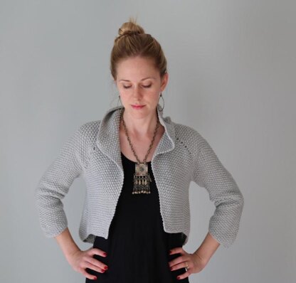 While designing this shrug, I was inspired by the softness of a single-ply yarn worked in textured Seed Stitch and wanted to echo that feeling in gently curving lines in the garment itself. Short rows were the perfect way to achieve this, so I incorporated them into all horizontal edges of this shrug: the high collar, the bottom hem, and the sleeve cuff. The short rows and sloping edges also give the shrug body, and a bit of soft “puff”. The final piece is a pretty winter garment, chic enough for wearing over party dresses, and cozy enough for cuddling up by the fire afterwards.