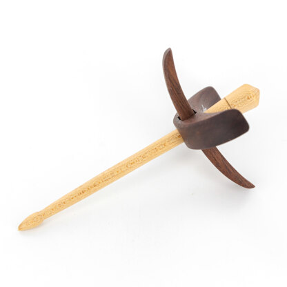 The Mini Turkish Spindle from Snyder Spindles is handmade from black walnut or maple. The arms measure 2.5" and the shaft is 4.25" long. The shafts have a small finial to hold the half hitch. Mini Turkish spindles weigh only 0.3–0.4 oz (8.5-11.5g) and are suitable for spinning thin, lace-weight yarns.