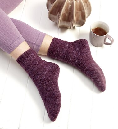 Raindrops on socks and warm woollen … socks! These could certainly be some of our favourite things! These pretty cocktail themed socks are knitted toe-up with included instructions for the shadow wrap short row heel and the pretty Purple Raindrop stitch pattern.