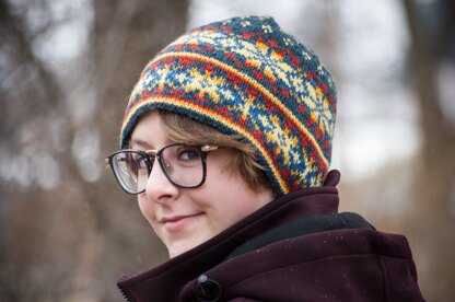 This hat is worked from the bottom up with a hemmed brim. The chart is worked using the stranded method. Always pick up the darker color over the lighter color and pick up the lighter color from under the darkercolor. Keep floats loose. For floats longer than seven stitches, tack stranded yarn on the wrong side of the work.