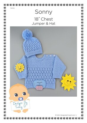 Sonny is a Unisex Baby Knitting Pattern for a jumper / sweater and matching hat to fit a baby 18" chest size. It is made using DK yarn and 4mm needles