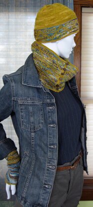 Worked in bold color combinations, or something more subtle, the pieces in this easy to knit set of accessories can be worked up quickly for yourself or as a gift. The set includes a cap, boot toppers, fingerless mitts and a cowl. The hat, fingerless mitts and boot toppers are available in 4 sizes, while the cowl can be made in a short or long version. Each piece is provided in two variations.