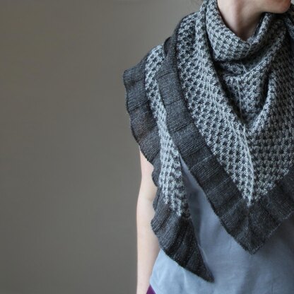 Knit down and out from the top center, Spark of Grey is a symmetrical triangle shawl with a flair for texture. Slipped stitches create the two-color pattern, while the wide ribbed border adds a romantic, ruffled touch.