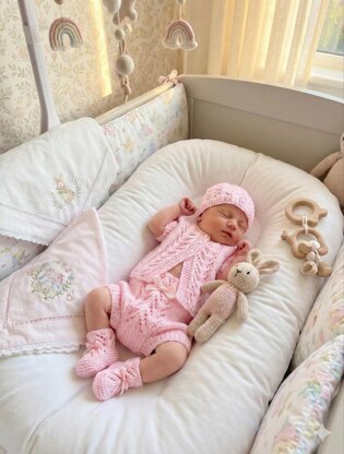 A beautiful 4 piece set. The cardigan is knitted from the neck down on single pointed needles so requires minimum sewing and no seams making it nice and comfy for the baby. The knickers, shoes, and bonnet are easy to knit and beautifully compliment the outfit