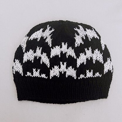 Black bats and glow-in-the-dark bats fly across this spooky hat. And it's even creepier at night, when the white bats glow eerily in the dark! This fun and festive knitting project is perfect for adding a touch of spooky style to your wardrobe, whether at Halloween or at any time of the year.