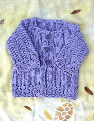 A pretty little spring cardigan for the little girl you love. The body is knit as one piece to the underarms where the back and front are divided and knit separately to the shoulders. The sleeves are knit separately then sewn into the armholes.