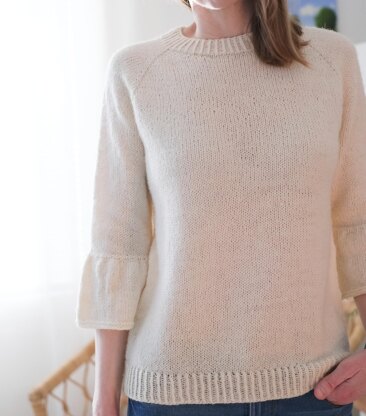 Beautiful raglan sweater with ¾-length sleeves. The sweater is worked seamlessly from top down and requires minimal finishing. The work begins with the neck ribbing. The neckline is then shaped with short rows. When the raglan increases are completed, sleeve stitches are placed on hold. The body is then worked in the round towards the hem and finished off with the ribbing. Sleeve stitches are then placed back on the needles and the sleeves are worked in the round, adding a delicate frill at the elbows. The pattern includes a photo tutorial for german short rows.
