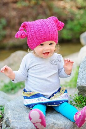 Rectangular hats are easy to knit and ultra adorable. There is no shaping involved, and this one can be knit exactly to the proper length for its recipient without any pattern modification. This cap is worked bottom up with a simple cable repeat—it’s a great first cabling project. The stitch pattern also makes it super stretchy, so consider knitting a size up for an even longer wear-time on your growing child. Modeled with the Sarabeth Cardigan (also by Tot Toppers)