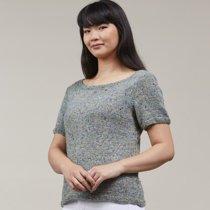 Alora Tee from Stacy Charles Fine Yarns is a lovely yet simple women’s sweater knit in Gemma. The pullover is as easy to knit as it is to wear, featuring seed stitch around the neckline, cuffs, and hem with set-in short sleeves. Alora is knit flat in pieces from the bottom up and then seamed. Charles Fine Yarns Gemma is a colorful yarn with a great hand and texture. This worsted weight yarn is a blend of recycled cotton, recycled polyester, and polyamide and will add flecks of color to your projects.