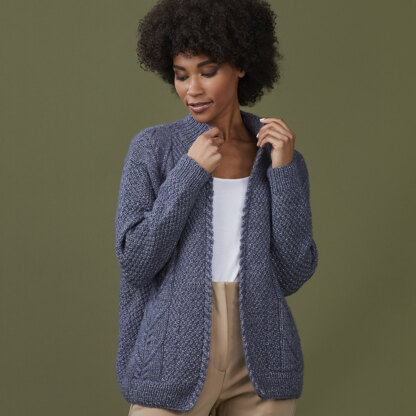 Stacy Charles Fine Yarns Bella Cardigan is a fabulous women’s open-front sweater knit in Megan. The cardigan features an all-over moss stitch with lovely cable panels that runs up front and back with dropped shoulders, long sleeves, a stand-up collar, and pockets. Bella is knit flat in pieces from the bottom up and then seamed. Megan by Stacy Charles Fine Yarns is a lightweight yarn with a bit of glitz. This yarn is perfect for an evening cardigan or shawl. The cable patterns are charted and written out.