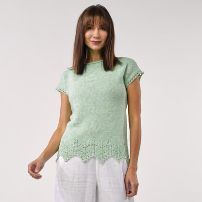 Stacy Charles Fine Yarns Leah Tee is your anything but basic top! This women’s pullover is knit in the round from the bottom up, and the delicate lace edges on the hem and sleeves add a flirty touch. Worked in Amelia—a lightweight blend of silk, linen, and cotton perfect for warmer weather—Leah Tee is a figure-flattering garment you’ll reach for time and again. Note: Lace pattern is written only.