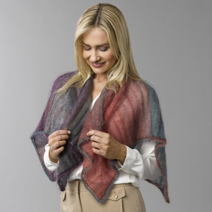 Leigh Shawl from Stacy Charles Fine Yarns is a modular knit shawl where one side of each square is created by picking up stitches from the previous square, stitches are cast on to create the perpendicular side, and centered double decreases form the mitres. Four colors of self-striping Luna Effects give this shawl so much color that Leigh Shawl will match anything in your wardrobe.