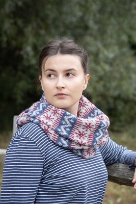 This warm and cosy cowl with its geometric Fairisle pattern is knitted in three colours of Rowan Felted Tweed DK.