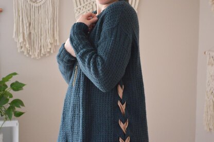 Stay Wild Moon Child is a classic pullover with a modern bohemian twist! The front and back are knit flat in a simple texture pattern and are seamed at the shoulders. Then, the side ribbing sections with buttonholes are picked up and worked outward from the body. Sleeves are worked outward in the round to minimize seams and bulk. After the sweater is complete, a feminine silk ribbon is woven through the side buttonholes for a unique accent. The sweater has a drop shoulder and easy, oversized fit and features a split, uneven hemline for a modern design that is flattering on many body types. Knit in Myak yarns Baby Yak yarn a soft yarn that knits up to a delightful lightweight fabric.