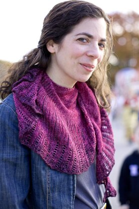 Worked from the top down, with crescent shaping, this shawl design works perfectly with hand dyed ombre yarns like Nightfall by Fibro Fibers which has a gradient that spans the entire length of the skein.