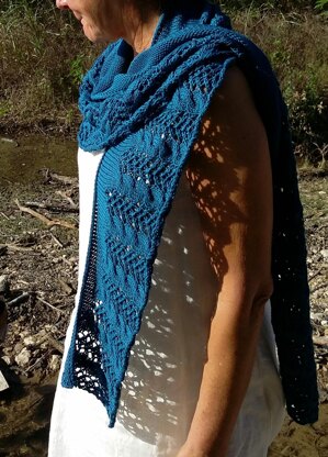 This shawl is worked from the bottom up beginning with the lace cable twist pattern. The shaping is done with easy to work short rows in stockinette stitch. An I-cord bind off completes the shawl for a beautiful finished edge.