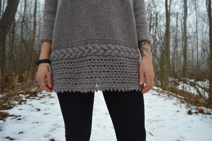 Story is an oversized, tunic length, boxy sweater with a bohemian flair. This design is perfect for layering over leggings and the easy fit is flattering on all body types! The bottom edge features a braided cable, lace, and picot edging that is feminine and fun. An interesting construction makes for an enjoyable knit; the front and back pieces are knit from side to side. The shoulders are seamed and then the 3/4 length sleeves are picked up and worked outward from the body. Knit up in Blacker Yarns Tamar Lustre Blend, this top has lovely drape and the fabric created has a subtle fuzzy halo and lustrous shine.