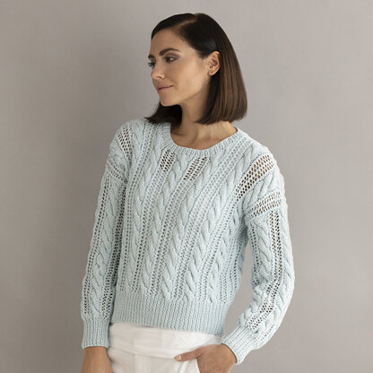 The Elizabeth pullover combines cables and simple lace together for stunning texture on this drop sleeve pullover. The openwork pattern makes it perfect for layering over a sleeveless tank in the summer or a turtleneck in the winter. The pullover is made in pieces from the bottom up and then seamed.