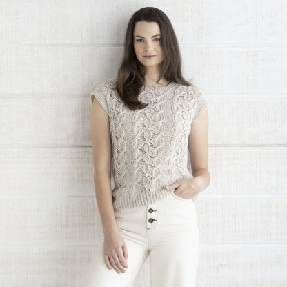 The String Eloise Tee is a chic, sleeveless top with striking cables criss-crossing up the front across on a reverse stockinette stitch background. Top is knit flat in pieces from the bottom up and seamed with a three-needle bind-off at the shoulders and seams joining the sides. Ribbed trims are picked up around the neck and armholes for a tidy finish. Amalfi is a lightweight blend of viscose, wool, silk, and cashmere that has a luxurious feel and easily transitions through seasons.