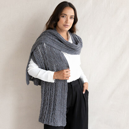 Cables and lace combined with tweedy String Tuscany create the beautifully unique texture of the Hazel Shawl. The shawl is generously sized with stunning drape so it can be used as a wrap or a scarf.