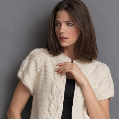 Stunning chains of cables running down the borders of the fronts, and down the middles of the sleeves and down the center of the back of this simply constructed vest. The pullover is knit in pieces from the bottom up. An I-cord edging is applied to the front, bottom, sleeve and neck edges.