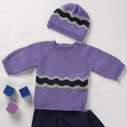 Puddle Jumper Baby Set is a sweet little hat and pullover set for babies and toddlers. The sweater is knit in one piece from the top down, and the hat is worked seamlessly in the round from the bottom up. Thanks to a clever increase technique, the colorwork pattern looks like Fair Isle but actually only uses one color at a time. - String Breeze is is a unique blend of cashmere, silk and cotton soft enough for your little one's delicate skin. Check out the Puddle Jumper Baby Blanket for the matching blanket. - - Note: Chevron stitch pattern is written only.