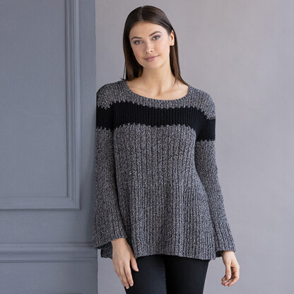 The Tiffany Pullover is a stunningly flattering shape! The sweater flares out at the waist to give extra room in the hips matches that style with slightly flared sleeves. String Amalfi is combined with Dolcetto DK to create a stripe across the body that moves across the inset sleeves. Knit in pieces and then seamed.