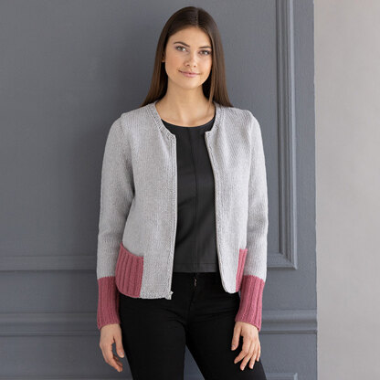 Keep it simple with the Valerie Jacket in String Dolcetto. This striking sweater is designed to have a zipper inserted and best of all, pockets! Knit in pieces and then seamed.