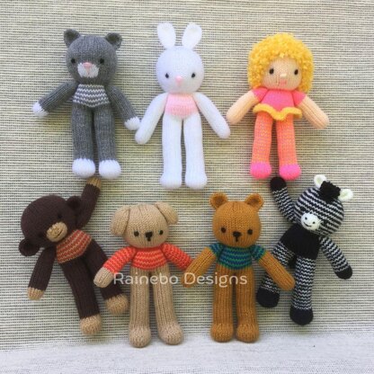 These Striped Sweet Peas are knit in the round, using Magic Loop or double pointed needles. The legs, body, arms and head are all knit on as you work along. They are approx. 7 ½” tall (without ears) and are created using #3-light wt. (DK wt.) yarn. Choices: Bunny, Bear, Kitten, Monkey, Puppy, Doll, Zebra with different striping options. Striped Sweet Peas are great for little hands and craft table items. List of yardage, yarns and supplies can be found on my Ravelry pattern site.