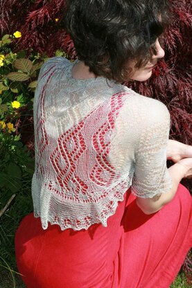 The delicate effect of lace weight yarn is hard to resist. However if you don’t wear shawls this shrug makes a great alternative. Worked as a rectangle of lace, sleeves are grafted together and the edging around the body of the shrug is worked directly from the remaining stitches. For added impact a garter stitch short-row ruffle is worked at the back of the shrug and scalloped edging is worked around the opening. Full details of the following techniques are given: Crochet Cast on Elastic Bind off Grafting Wrap and Turn
