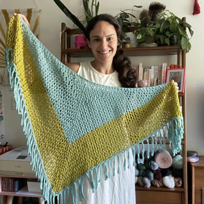 The Summer Fringe Shawl is a triangular knit shawl that features a simple eyelet lace pattern. The shawl is color blocked and the easy-to-memorize stitch repeat allows for a customizable shawl size. Knit up in Tahki Yarn’s Tiburon, a lovely blend of cotton and lyocell, the Summer Fringe Shawl has a nice drape and a lovely, fresh, cool feeling against your skin. The open fabric and fringe edging make for the perfect extra layer to wear at the beach or for enjoying a summer evening!