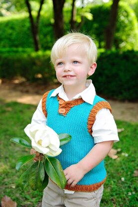 This classic design is worked seamlessly and accented with a front placket, making it easy to slip over a little one’s head. Fabric is knit intentionally loose for breathability during warm weather. Use bulkier yarn at gauge for a cozy cool weather vest. Play around with colors, stripes and buttons to personalize this simply adorable piece.