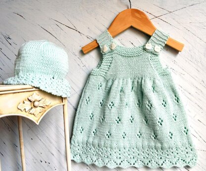 Sweet little sun dress with matching hat. This is a relatively easy knit with just a little lace trim at hemline, and eyelet pattern on skirt, and the length is easily adjusted. Knits up quickly. Perfect for the summer months!Extra materials required4 buttons for dress,Stitch holders. The pictured outfit was knitted up in Rico Baby Cotton Soft DK.
