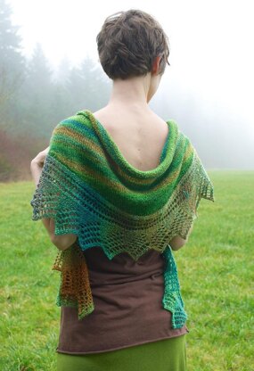 Coax out your inner wood sprite with this ethereal shawl. It's a gentle, feminine piece that will add an extra layer of warmth to most any outfit. The lace is worked end-to-end, with the body stitches picked up and shaped with short rows to create a crescent that shows off long-repeat variegated yarns magnificently. Or, try with a solid color and a contrasting lace edging for a fun look.