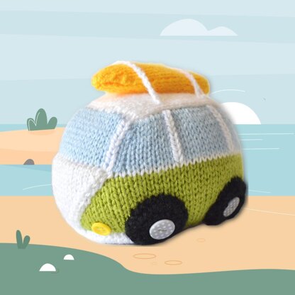 For retro fans and surfers this chubby little Camper Van is sure to delight. Designed by Amanda Berry @fluffandfuzz, the camper van and surfboard are knitted in acrylic DK yarns on single pointed needles (not in the round). There is no tricky colour-work to master here, if you can change colour at the end of a row to knit stripes then you can make a camper. The camper van pieces are knitted in stockinette stitch and sewn together, and the white window struts are embroidered after knitting in duplicate stitch. For confident beginners and above, other techniques used include casting on and off, knits, purls, increases and decreases, knitting stripes, and seaming to finish.