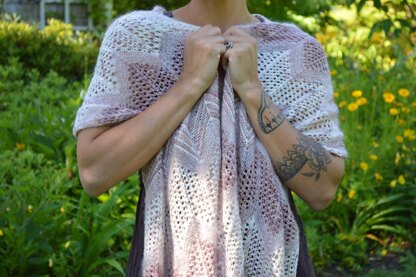Swanky Chic is a delicate wrap that is perfect for wearing over a dress on a warm summer night! The design features simple garter and eyelet sections in an interesting chevron pattern. Simple increases and decreases make up the shaping on each right side row. The stitch patterns are easy to memorize, yet there is variation which makes for a really enjoyable knitting project! Pairing two colors of single ply fingering weight and one color of mohair/ silk yarn, this design is light, airy, soft, and sweet! Knit up in The Farmers Daughter Fibers yarns; this design is perfect for speckled or semi solid hand dyed yarns!