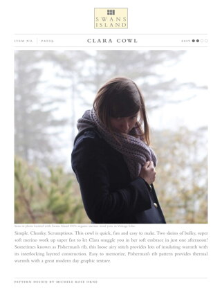 Swans Island Clara Cowl PDF is a Knitting pattern by Michele Rose Orne, available as a Downloadable PDF and includes instructions in English. Super fun to make, this pattern could be your next masterpiece!