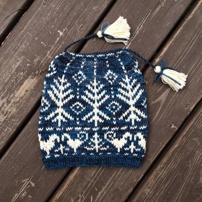 This hat is one in a series of hats exploring world cultures and looking for new knitting inspiration in crafts, ethnic art and other areas not normally associated with knitting. I have turned Maori tattoos into knitwear as well as African fabric motifs and even a Cree inspired ceiling in a lodge in Minnesota. Old Swedish embroidery samplers provided the chickens in the first border, and Swedish Huck weaving (which is really embroidery) gave the idea for the angular motif in the upper section of the hat. Many Huck pieces remind me of reflecting pools, the bottom section often the mirror image of what is above.