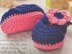 Cute crochet baby shoes made in ttwo contrasting dk yarns. Simple to make and can be completed in just an evening. Count the stitches on the sole carefully when working them.