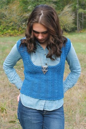 Vertical columns create a slimming look combined with a slight texture for beauty. The simple 4 row pattern repeat is easy to memorize and a great first time vest project. The extra deep neckline is not only stylish but wearable year round. Pattern comes in 2 lengths, cropped and long. Vest is intended to be worn with a negative ease - so when in doubt, go down a size. Vest is knit in the flat.