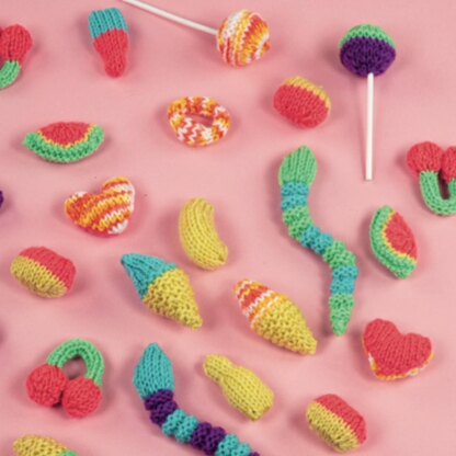 For toy boxes or little charms, these sugar free treats are sure to sweeten your day. The assortment includes my pick n mix favourites: rhubarb and custard hard candies, ball lollipops, chocolate ice creams, foam bananas, gummy love hearts, fruit slices, milk and cola bottles, snakes, rings and cherries. These little sweets use simple increases and decreases for shaping, and each makes a super project for using up leftover yarn. Designed by Amanda Berry @fluffandfuzz, the toys are knit in DK yarns on single pointed needles (not in the round). For confident beginners and above, other techniques used include casting on and off, knits, purls, increases and decreases, short rows, changing colours at the end of a row, and seaming to finish.